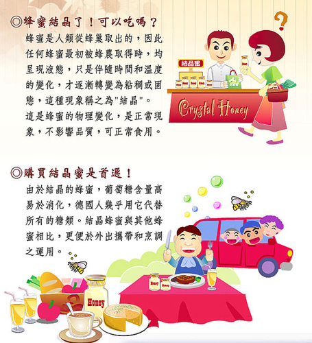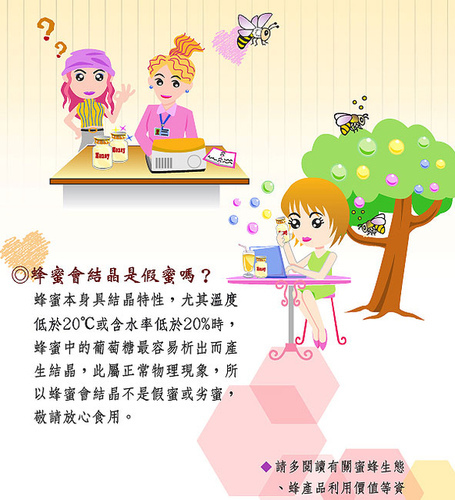 蜂蜜結晶是正常現象,請安心食用蜂蜜是蜜蜂採集植物花蜜,經蜜蜂釀造濃縮加工而成,在常溫下呈透明或半透明粘稠狀液體,顏色及香氣常隨蜜源植物種類而異,一般顏色淺者香味清淡,顏色深者香味濃厚。蜂蜜具有結晶的特性,尤其在低溫(低於20℃)或蜂蜜含水率低於20﹪時,蜂蜜中的葡萄糖最容易析出產生結晶,此乃正常物理現象,尤其含葡萄糖比例較高的蜂蜜較易發生,如荔枝蜜、油菜蜜、咸豐草蜜、柑橘蜜、文旦蜜、冬蜜、尤茄利、白千層等,所以結晶不是假蜜或劣蜜,請安心食用。