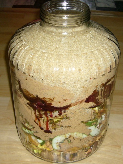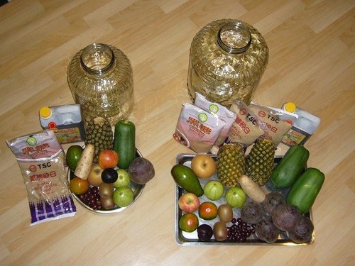 伍.水果逐樣切好放入甕中後,將菌種水均勻混合扮入蔬果(請參考二.菌種水培養)。