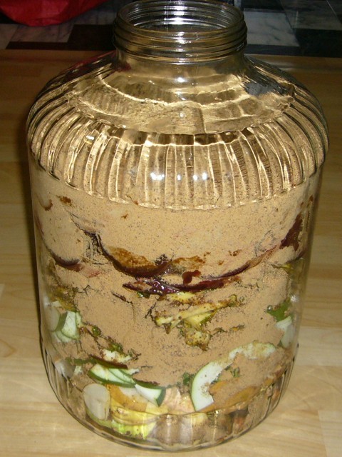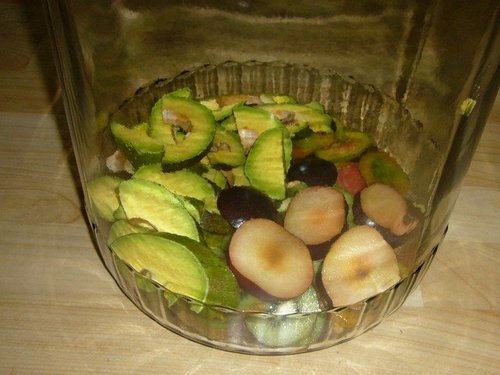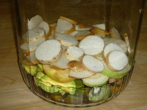 伍.水果逐樣切好放入甕中後,將菌種水均勻混合扮入蔬果(請參考菌種水培養)。