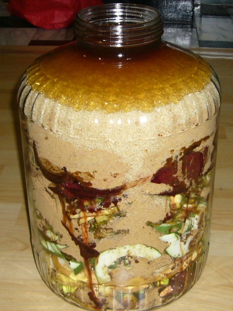 7.混合:將水果、菌種水及過濾水、蜂蜜、均勻入甕、最後覆蓋黑糖及褐色冰糖,以塑膠袋、膠繩封口。 *(活菌蜂蜜酵素原液於第二週加入即可、可防止酒味產生、減少苦澀味、蜂蜜酵素也可直接稀釋五倍飲用)。