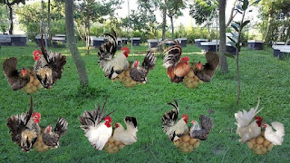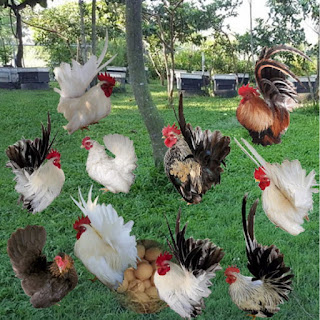 飛來蜜養蜂場果園目前飼養了金飾,銀飾,金莎,黃金,金蘆花,哥倫,黃哥倫,全白,的矮雞,為確保色系及優良品種,都特別選種配對及育雛