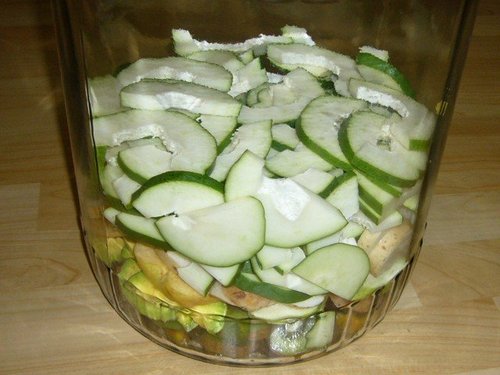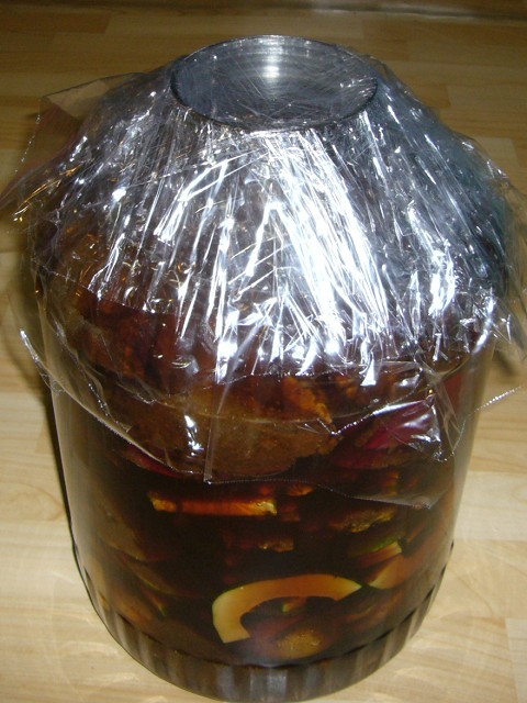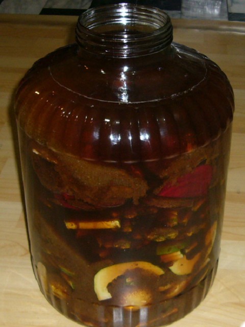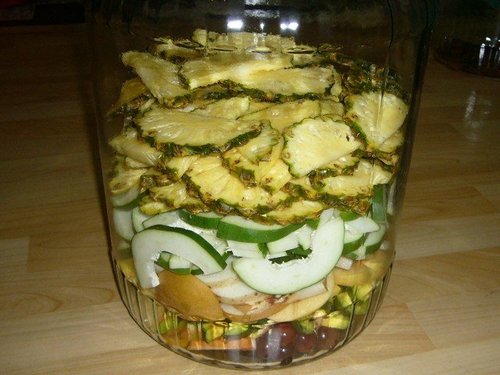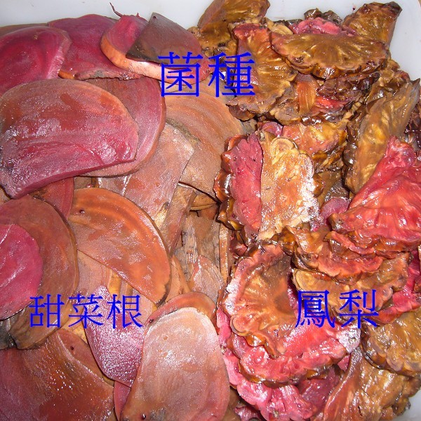 伍.水果逐樣切好放入甕中後,將菌種水均勻混合扮入蔬果(請參考二.菌種水培養)。