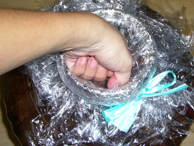 拾壹.握拳放在甁口,將保鮮膜向下壓出酵素發酵需要的空間,再用塑膠繩綁緊。